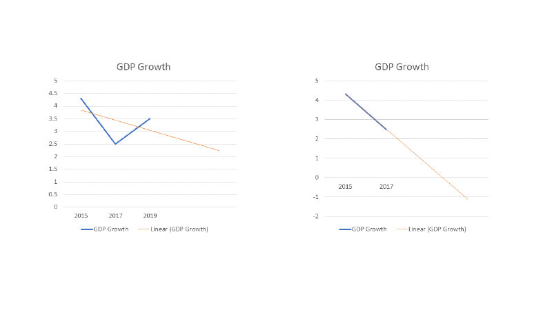 ໂຕໃດກໍ່ບໍ່ສຳຄັນກ່ອນ ໄລຍະເວລາຂອງຂໍ້ມູນ ຂໍ້ມູນແຕ່ລະປະເພດທີ່ເຮົາມີຈະຕ້ອງ ມີຫຼາຍກ່ວາ 2 ໄລຍະເວລາຂຶ້ນໄປ ເພາະວ່າຂໍ້ມູນພຽງແຕ່ສອງອັນຕ່າງໄລຍະເວລາກັນ ເຮົາບໍ່ສາມາດເບິ່ງທ່າອ່ຽງ (trend) ຂອງມັນໄດ້. ຖ້າເຮົາມີຂໍ້ມູນພຽງແຕ່ 2 ຊຸດ ຖືວ່າຈົບກັນ ເຮົາເອົາຂໍ້ມູນມາໃຊ້ບໍ່ໄດ້. (ເບິ່ງພາບຂ້າງລຸ່ມປະກອບ)