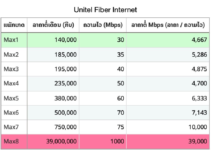 ຈາກຮູບດ້ານເທິງ ເຮົາສັງເກດເຫັນວ່າ ແພັກເກດທີ່ຄຸ້ມຄ່າທີ່ສຸດແມ່ນ ແພັກເກດເລີ່ມຕົ້ນ Max1 ເຊິ່ງວ່າຕົກຢູ່ ແມັກລະ 4,667 ກີບ. ກົງກັນຂ້າມ ແພັກເກດທີ່ແພງທີ່ສຸດ ແມ່ນແພັກເກດທີ່ບໍ່ຄຸ້ມທີ່ສຸດ ຄື 39,000 ກີບ ຕໍ່ແມັກ!