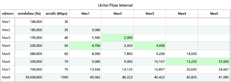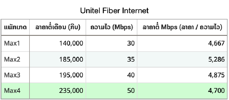 ເຮົາຈະມາເບິ່ງກັນວ່າອິນເຕີເນັດສາຍໄຟເບີ (fiber optic) ແພັກເກດຄຸ້ມຄ່າກວ່າກັນ ໃນການປຽບທຽບແມ່ນ ເຮົາຈະປຽບທຽບຂອງຄ້າຍ Unitel. ສ່ວນວິທີການປຽບທຽບແມ່ນ ກໍຈະປຽບທຽບກັນລະຫວ່າງ ຄວາມໄວ ກັບ ລາຄາທີ່ເຮົາຈ່າຍໄປ ລວມເຖິງເບິ່ງໄປຫຼາຍໆແງ່ມຸມວ່າ ຄຳວ່າຄຸ້ມຄ່າ ໃນບ່ອນນີ້ໃນມຸມມອງຂອງຜູ້ທີ່ກຳລັງໃຊ້ແພັກເກດເກົ່າ ແລະ ຢາກປ່ຽນໄປໃຊ້ແພັກເກດໃໝ່ຈະໄປແພັກເກດໃດດີ ກັບ ຜູ້ໃຊ້ໃໝ່ທີ່ຢາກປ່ຽນມາໃຊ້ຈະເລີ່ມຈາກແພັກເກດໃດດີ?